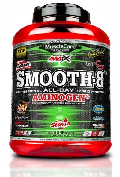Smooth-8™ de la nueva línea MuscleCore® de Amix™ es un suplemento "todo en uno" de última generación que combina 8 tipos de proteína de la máxima calidad y 4 tipos de hidratos de carbono de la máxima pureza, para asegurarnos que las fibras musculares estén alimentadas y en continua recuperación y crecimiento durante muchas horas.