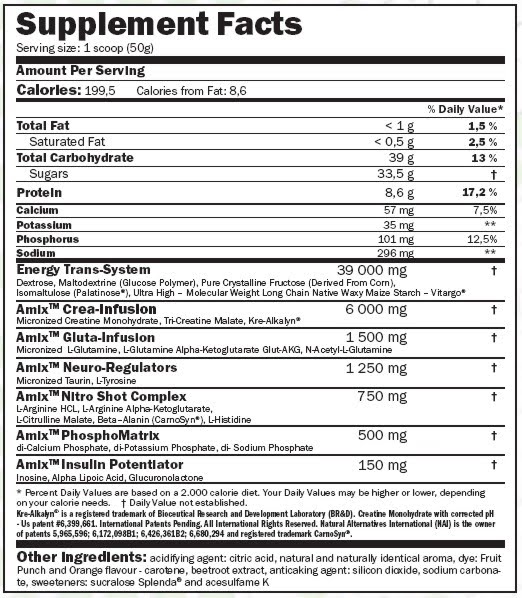 Dextrosa, maltodrextrina, monohidrato de creatina, fructosa, isomaltulosa (Palatinose®), taurina, L-glutamina, tri-creatina malato, L-arginina HCL, ácido cítrico, Kre-Alkalyn®, L-tirosina, di-fosfato de calcio, acetil L-glutamina, L-glutamina alfa cetoglutarato, bicarbonato de sodio, L-arginina alfa cetoglutarato, di-fosfato de potasio, di-fosfato de sodio, inosina, aroma, citrulina malato, ácido alfa lipoico, beta-alanina CarnoSyn®, L-histidina, glucoronolactona, edulcorantes: Sucralosa (Splenda®) y Acesulfamo K, dioxido de sicilio.