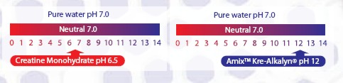 La velocidad de conversión de Creatina a Creatinina está directamente relacionada con el pH del líquido usado para mezclar, a menor pH, más rápida la conversión. Kre-Alkalyn® tiene un pH por encima de 12 debido a su proceso de fabricación. Como resultado, permanece completamente estable y alcanza las células musculares, ayudando al cuerpo a absorber más Creatina, y por lo tanto disminuyendo la dosis requerida para obtener resultados óptimos.