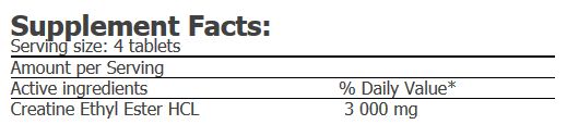 Creatina etil éster HCl, celulosa microcristalina, dióxido de silicio coloidal, glicolato de almidón de sodio, sodio estearil fumarato, estearato de magnesio .