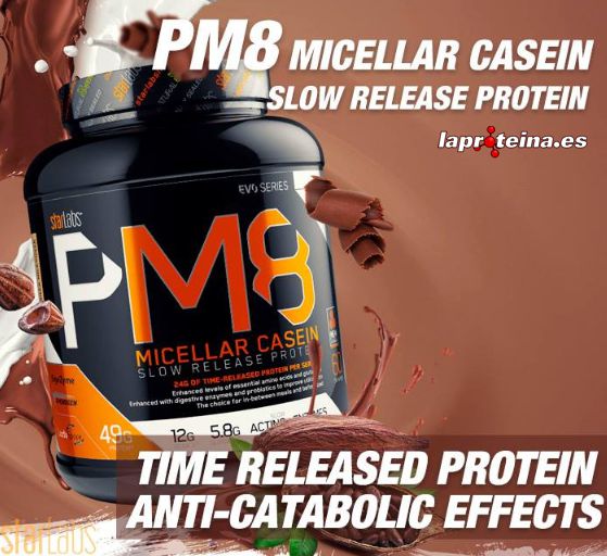 PM8 Micellar Casein de StarLabs es un suplemento en polvo que contiene solamente la mejor caseína micelar de lenta digestión procedente de aislado de proteína de leche y reforzada con enzimas digestivas patentas (DigeZyme® y Aminogen®) y probióticos (LactoSpore®).