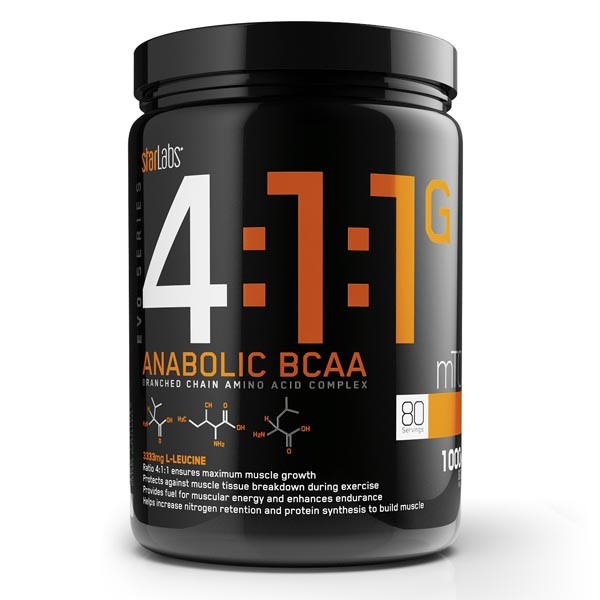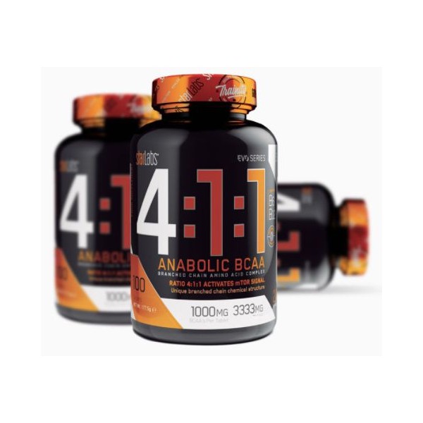4:1:1 Anabolic BCAA de StarLabs es un suplemento en tabletas que proporciona 5 gramos de una combinación de L-leucina, L-isoleucina y L-valina en ratio 4:1:1 que además está enriquecida con las vitaminas B6 y B12 por servicio de 5 tabletas.