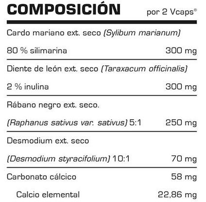 Extracto de silimarina, dandelion (raíz), extracto seco de rabano negro, extracto seco de desmodium, carbonato cálcico.
