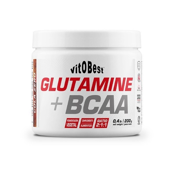 Glutamine + BCAA de Vitobest es un suplemento en polvo de élite que combina 5 gramos de aminoácidos de cadena ramificada (BCAAs) en ratio 2:1:1 con 5 gramos de L-glutamina de máxima pureza Ajinomoto®.