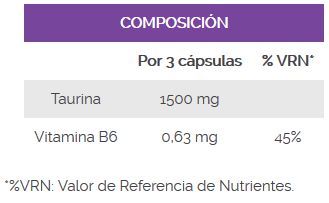 L-taurina, vitamina B6 (clorhidrato de piridoxina) y antiaglomerante (estearato de magnesio vegetal).