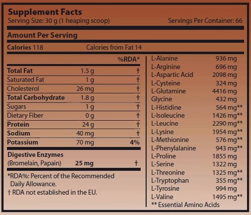 Chocolate con leche: Mezcla de proteína de alta calidad (concentrado de proteína de suero soluble que contiene: fracciones de proteína de lactoglobulia, lactoferrina, lactalbúmina e inmunoglobulina, concentrado de proteínas de mayor valor biológico provenientes de leche, caseína micelar, proteína de clara de huevo), cacao en polvo (10-12%), aromas (chocolate, vainilla), espesante (goma xantana), edulcorantes (acesulfamo-K, sucralosa), bromelaína, papaína.