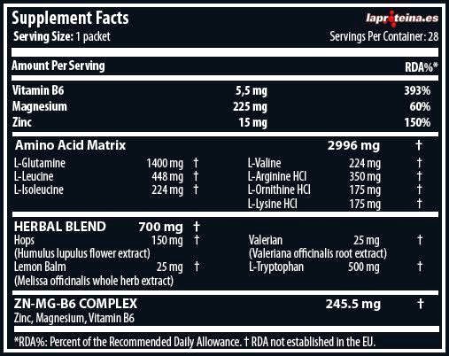 Fórmula especial de apoyo nutricional nocturno. Contiene BCAAs, Glutamina, Arginina-Ornitina-Lisina, extracto de Lúpulo, Valeriana y Melisa, L-triptófano y ZMA.