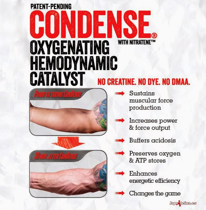Condense™ provocará una bienvenida cascada de anabolismo y de beneficiosas mejoras fisiológicas en los deportistas a través del aumento del flujo sanguíneo, lo que a su vez aumentará la utilización de los sustratos (es decir, una mejor absorción de nutrientes), preservando tus reservas de ATP, impulsando una entrega de oxígeno a las fibras musculares, y una reducción del gasto de oxígeno de modo que te permitirá manejar cargas de trabajo mayores (por ejemplo, más de peso) durante más tiempo antes de que aparezca el agotamiento (por ejemplo, más repeticiones).