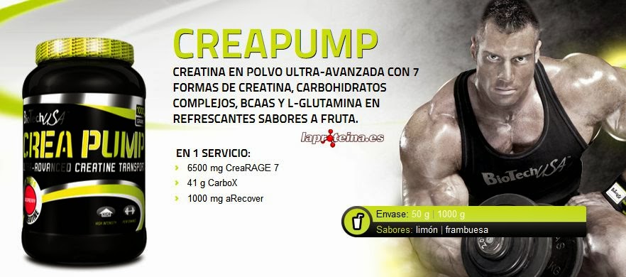 CreaPUMP™ de BioTech USA es un voluminizador científicamente desarrollado que incluye en su fórmula la matriz de 7 formas de creatinas avanzadas CreaRage™, que activan una inmensa explosión de creatina en tus músculos, carbohidratos complejos, BCAAs y glutamina para aumentar la fuerza y la masa muscular con la ayuda del entrenamiento adecuado.