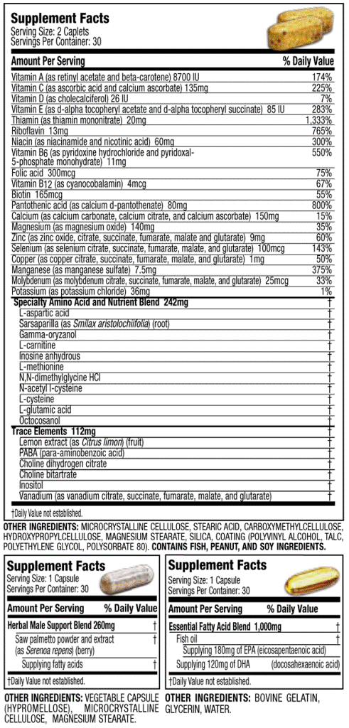 Mezcla vitaminas, minerales y ácidos grasos esenciales que todo atleta necesita. Enriquecido con saw palmetto.