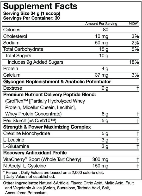 Reposición de glucógeno y potenciador anabólico (dextrosa), Mezcla nutritiva superior de liberación de péptidos ((GroPlex™ [proteína de suero parcialmente hidrolizada, caseína micelar y lecitina], concentrado de proteína de suero de leche), Pea Starch (como Carb10™), Matriz optimizadora de la fuerza y la potencia (creatina monohidrato, L-leucina, L-glutamina), Perfil antioxidante para la recuperación (VitaCherry® Sport (cereza entera), N-Acetil-L-Cisteína).