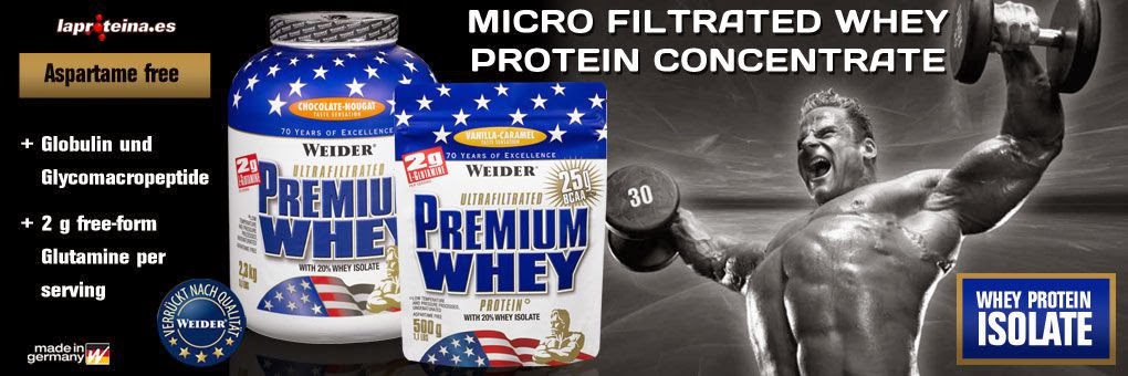 Premium Whey de Weider dentro de la línea dirigida a culturistas y atletas profesionales Global Weider es una proteína elaborada a partir de las mejores materias primas como son el concentrado y el aislado de suero de leche y enriquecida con péptidos de L-Glutamina.
