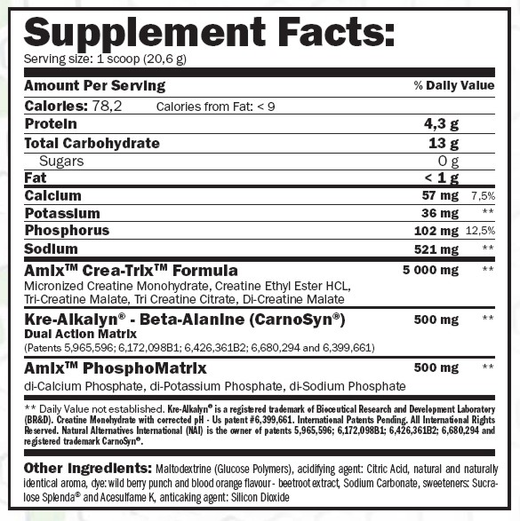 Maltodextrina, monohidrato de creatina, ácido cítrico, creatina ethyl ester, sodio bicarbonato, tri-creatina malato, Kre-Alkalyn®, fosfato di-cálcico, di-creatina malato, tri-creatina citrato, beta-alanina (CarnoSyn®), fosfato di-potasio, fosfato di-sodio, aroma, colorantes: Extracto de remolacha, edulcorante: Sucralosa (Splenda) y acesulfame K, dióxido de sicilio.