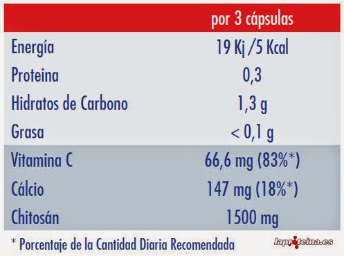 58,8% chitosán, fosfato dicálcico, gelatina, ácido l-ascórbico (vitamina C), antiaglomerante: estearato de magnesio; colorantes: E171, E172.