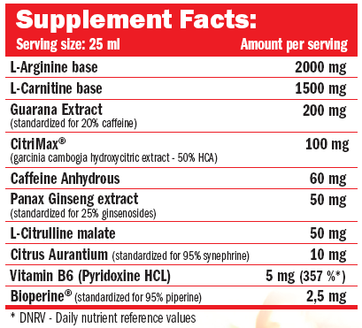 Agua purificada, L-arginina base, L-carnitina base, ácido cítrico, extracto de guarana, HCA-ácido hidroxicítrico, aromas, cafeína, extracto de ginseng, citrulina malato, extracto de citrus aurantium, piridoxina HCL (Vitamina B6), extracto de pimienta negra (Bioperina), conservantes: Sorbato de potasio, edulcorante: Sucralosa y acesulfamo K.