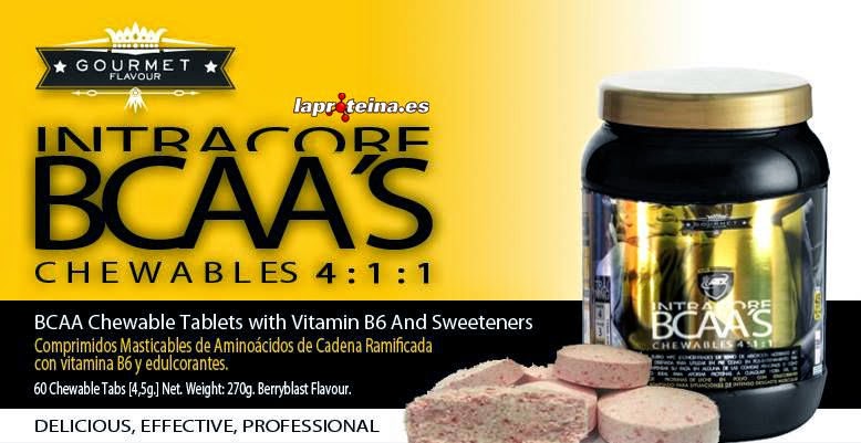 Intracore BCAA´s Chewables 4:1:1 de MTX Elite BodyBuilding contiene aminoácidos de cadena ramificada con un ratio especial 4:1:1 entre Leucina, Isoleucina y Valina, y enriquecidos con vitamina B6, presentados en unas deliciosas tabletas masticables de 4,5 gramos con sabor a frutos rojos.