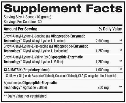 Glicil-alanil-Lisina-L-leucina (como Oligiopeptide-Enzymatic Technology™ glicil-alanil-Lisina-L-leucina), Glicil-alanil-Lisina-L-Isoleucina (como Oligiopeptide-Enzymatic Technology™ glicil-alanil-Lisina-L-Isoleucina), Glicil-alanil-Lisina-L-Valina (como Oligiopeptide-Enzymatic Technology™ glicil-alanil-Lisina-L-valina), MATRIX CLA - Mezcla patentada (aceite de girasol [semillas], aceite de aguacate [fruta], aceite de coco [fruta], CLA [ácido linoleico conjugado], Agmatina (como sulfato de agmatina Oligiopeptide-Enzymatic Technology™).