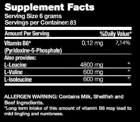 Cada servicio de 6 gramos de BCAA Ratio 8:1:1 te proporciona 4.800 mg de leucina, 600 mg de valina y 600 mg de isoleucina, por lo que se trata de una de las dosis más altas del mercado.