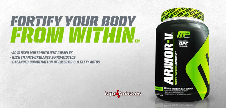 Armor-V™ es posiblemente uno de los complemento multivitamínicos más avanzados del mercado. Está cargado con una matriz de vitaminas y minerales que aporta todos los nutrientes necesarios para obtener el máximo de energía, enriquecido con unos complejos antioxidantes y desintoxicantes, con vegetales y probióticos que mejoran el sistema inmune, la absorción y la digestión y con ácidos grasos saludables para promover la pérdida de grasas y la salud en general.