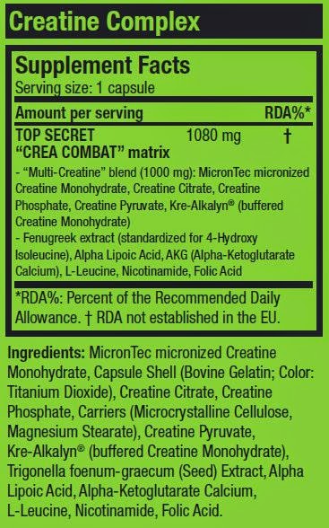 Complejo de creatina: Monohidrato de creatina micronizado “MicronTec”, agentes de recubrimiento (gelatina bovina; colorante: dióxido de titanio), citrato de creatina, fosfato de creatina, agentes de carga (celulosa microcristalina, estearato de magnesio), piruvato de creatina, Kre-Alkalyn® (monohidrato de creatina búferizado), extracto de semilla de Trigonella foenum-graecum, ácido alfa-lipóico, AKG (alfa-cetoglutarato de calcio), L-Leucina, nicotinamida, ácido pteroil-L-monoglutámico.