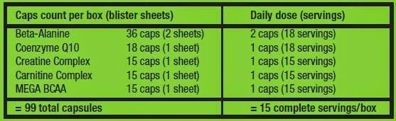 Contiene beta alanina, aminoácidos de cadena ramificada, una matriz con diferentes formas de creatina y otros componentes para maximizar su absorción, L-carnitina y coenzima Q10.