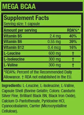 Mega BCAA: L-leucina, L-isoleucina, L-valina, agentes de recubrimiento (gelatina bovina; colorantes: plata fina Candurin®, negro brillante BN, óxido negro de hierro), D-pantotenato de calcio, piridoxina HCl, cianocobalamina, agente de carga (celulosa microcristalina).