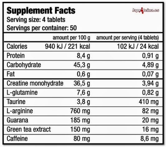 Creatina monohidrato, Dextrosa, Maltodextrina, L-glutamina, Taurina, Agente antiaglomerante (E553b, E470b, E551), Colorante (E162), L-arginina, Sabor, Regulador de la acidez (Ácido cítrico), Guaraná en polvo, Extracto de té verde, Cafeína.