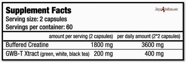 Creatina neutralizada, revestimiento de la cápsula (Gelatina), Extracto de té verde, Extracto de té blanco, Extracto de té negro.