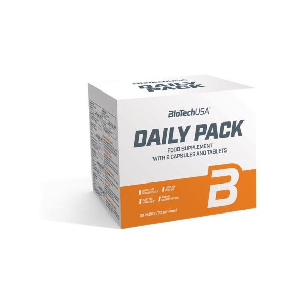 Daily Pack de BioTech USA es un suplemento total que contiene siete fórmulas individuales en dosis extremas en un solo producto, proporcionándote un potente refuerzo para la salud general del organismo que incluye un multivitamínico y multimineral muy completo, calcio y magnesio, coenzima Q10, extracto de semilla de uva, aceite de pescado Omega 3, lecitina de soja y vitamina C.