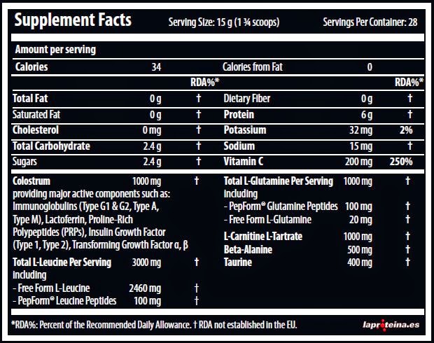 Aislado de proteína de suero de leche ultrafiltrado y microfiltrado por flujo cruzado (CFM) (contiene: beta-lactoglobulina, alfa-lactalbúmina, albúmina sérica bovina, inmunoglobulina G, lactoferrina, microfracciones de glicomacropéptidos de proteína), L-Leucina, dextrosa, aromas (frambuesa, cereza), calostro en polvo, L-carnitina L-tartrato, beta-alanina, taurina, acidulante (ácido cítrico anhidro), ácido ascórbico, hidrolizado de proteína de suero de leche, péptidos de glutamina PepForm®, péptidos de leucina PepForm®, edulcorantes (ciclamato de sodio, sucralosa, acesulfamo-K), L-glutamina, colorante (rojo cochinilla A**).