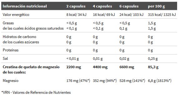 85,3% CREATINE MAGNA POWER® creatina de quelato de magnesio, incrementador de volumen – celulosa microcristalina; antiaglomerante – sales magnésicas de ácidos grasos; cápsula (gelatina, colorantes: E 171).