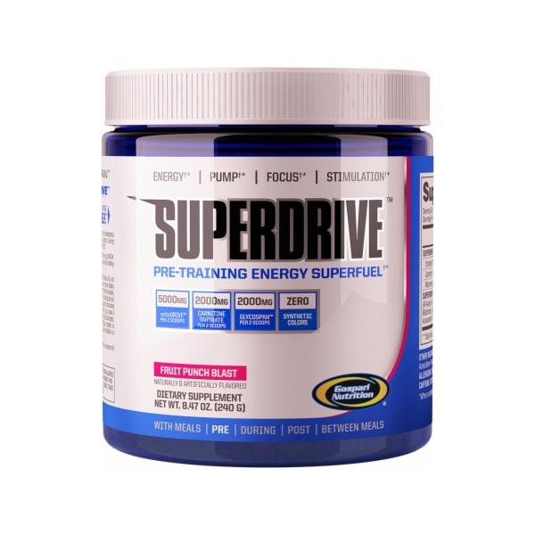 SuperDrive™ es el nuevo y revolucionario pre-entreno de Gaspari Nutrition que contiene los más exclusivos ingredientes patentados propios como los nuevos mitoDrive™ (ornitina malato) y Glycospan™ (triacetina) y que ha sido diseñado para mejorar el rendimiento durante el entrenamiento además de proporcionarte una energía explosiva, una estimulación sensorial y concentración únicas y mejorar los procesos de recuperación.