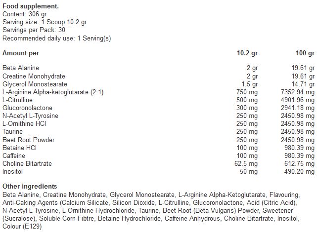 Complejo de resistencia (beta alanina CarnoSyn), matriz de aminoácidos, L-Leucina, calcio beta-hidroxi-betametilbutirato (HMB)), matriz de fuerza (creatina nitrato), matriz de energía y concentración (cafeína, colina bitartrato), matriz de vasodilatación (monoestearato de glicerol, L-citrulina aspartato (1:1), L-norvalina).
