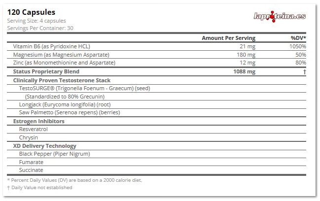 TestoSurge® extracto de alholva estandarizado para un 80% de Grecunin, extracto de Long Jack 20:01, sulfato de magnesio, zinc monometionina 20%, zinc aspartato 20%, vitamina B6, resveratrol, crisina, pimienta negra, fumarato, succinato.