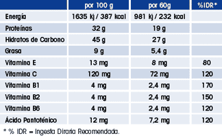 Sirope de glucosa, Proteína de leche, Cobertura de chocolate con leche, Sirope de fructosa, Aceite vegetal hidrogenado, Proteína de colágeno hidrolizada, Glucosa, Plátano desecado, Aromas, Sal, 120 mg Vitamina C, Ovoalbumina desecada, 13 mg Vitamina E, 13 mg Pantotenato cálcico, 4 mg Vitamina B1, 4 mg Riboflavina, 4 mg Vitamina B6.