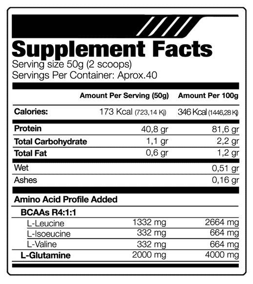 Como suplemento dietético mezclar 50 gramos (2 cucharadas rasas) disueltos entre 200 y 250 ml de agua fría y tomar preferiblemente después del entrenamiento.