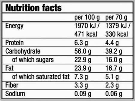 Avena, grasa vegetal no hidrogenada, jarabe de azúcar invertido, azúcar de caña, nueces pacanas, nueces, glicerina vegetal, lecitina de soja en polvo, aroma.