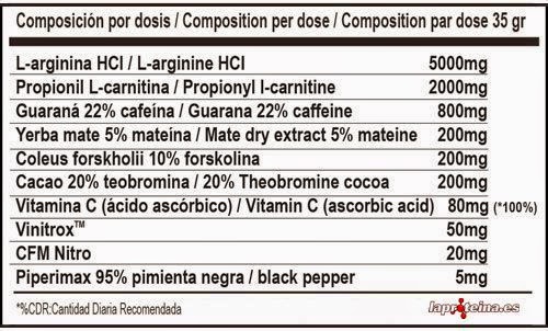La fórmula ha sido completamente rediseñada y se caracteriza por contener los más modernos compuestos como CFM Nitro, Vinitrox, propionil L-carnitina y arginina HCL, un aminoácido esencial que potencia la recuperación y cicatrización muscular, además de aportar unas gran energía para el entrenamiento gracias a la gran variedad de estimulantes naturales que contiene como la yerba mate, el guaraná, teobromina (contenida en el cacao), que aumenta la capacidad de concentración y de alerta para unos entrenamientos más eficaces.