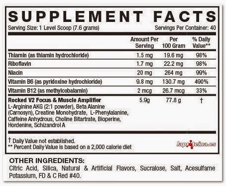 Mezcla Rocked V2 Focus & Muscle Amplifier: (L-Arginina AKG (2: 1 en polvo), beta alanina (CarnoSyn), monohidrato de creatina, L-fenilalanina, cafeína anhidra, bitartrato de colina, Bioperina, Hordenina, Schizandrol A.