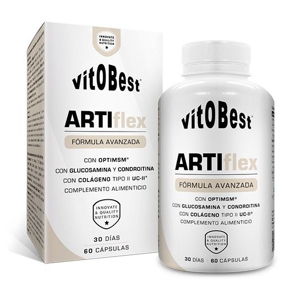 ARTIflex de Vitobest contiene una fórmula a base de sulfato de glucosamina, sulfato de condroitina, optiMSM®, colágeno hidrolizado UC-II® (Lonza) y otras sustancias bioactivas naturales que exhiben una importante acción analgésica, anti-inflamatoria y regenerativa del cartílago, con el fin de reforzar las articulaciones y los huesos de deportistas y personas sedentarias.