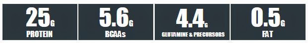 - 25 gramos de proteína, 5,6 gramos de BCAAs y 4,4 gramos de glutamina y otros precursores por servicio.