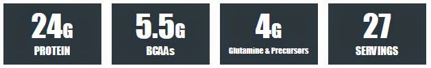 - 24 gramos de proteína, 5,5 gramos de BCAAs y 4,4 gramos de glutamina y otros precursores por servicio.
