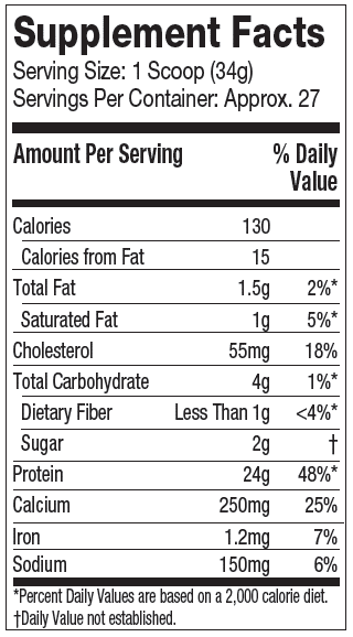 Como suplemento dietético para adultos sanos, mezclar 34 gramos (1 cucharada rasa) con 150-180 ml de agua fría o leche hasta disolver completamente en un mezclador o una batidora.