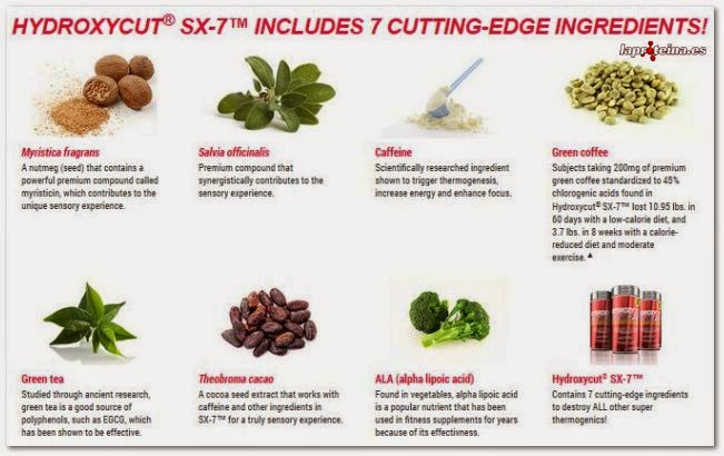 Los siete ingredientes de la fórmula especial de Hydroxycut SX-7 son el extracto de grano de café verde (como Coffea canephora robusta), la cafeína anhidra, el extracto de semilla de nuez de cola (como Myristica fragrans), la hoja de salvia en polvo (como Salvia officinalis), el ácido alfa lipoico, el extracto de semilla de cacao (como Theobroma cacao) y el extracto de hoja y brote de té verde (como Camellia sinensis).