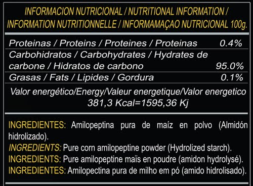 El carbohidrato más rápido, con mayor peso molecular, la más baja osmolaridad, menores problemas deigestivos y el mejor precio. 100% amilopeptina.