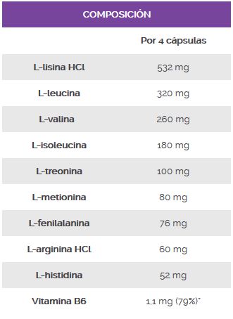 L-lisina clorohidrato, L-leucina, L-valina, L-isoleucina, L-treonina, L-metionina, L-fenilalanina, L-arginina clorohidrato, L-histidina, vitamina B6 (piridoxina clorohidrato), antiaglomerantes E-470b, E-504i y E-460, cápsula: gelatina y opacificante E-171.