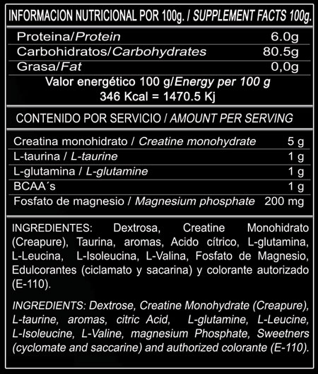 Es la creatina monohidrato de máxima pureza que se produce en Alemania (laboratorio AlzChem). La creatina induce claramente a un aumento de la capacidad de rendimiento en los ámbitos de fuerza máxima y ejercicio prolongado. La creatina mantiene y repone la energía necesaria para la práctica deportiva y evita el agotamiento de las reservas orgánicas de energía como el glucógeno o la proteína muscular.
