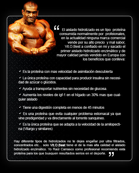 Iso-Protein Hydrolyzed de Vit.O.Best contiene el 100% de hidrolizado de aislado de suero, un tipo de proteína consumida normalmente por profesionales, que en la actualidad muy pocas marcas comerciales venden debido a su alto precio y mal sabor.