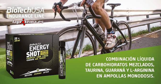 Energy Shot de BioTech USA dentro de su línea especial para deportes de resistencia "Endurance Line" es una fórmula extrema energizante con una mezcla de carbohidratos de cadena corta y larga (Glucosa, Fructosa, Maltodextrina, D-ribosa) enriquecida con taurina, guaraná, L-arginina y magnesio para ayudar a reducir el cansancio y la fatiga, contribuir a un óptimo equilibrio de electrolitos y proporcionar un intensa energía antes, durante y después de tus entrenamientos más explosivos.