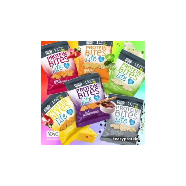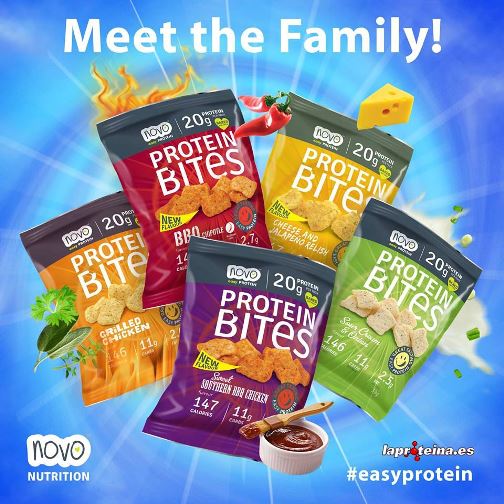 Protein Bites de Novo Easy Protein son unos deliciosos snacks salados en bolsas de 30 gramos elaborados a partir aislado de proteína de soja, concentrado de proteína de suero y aislado de proteína de suero.